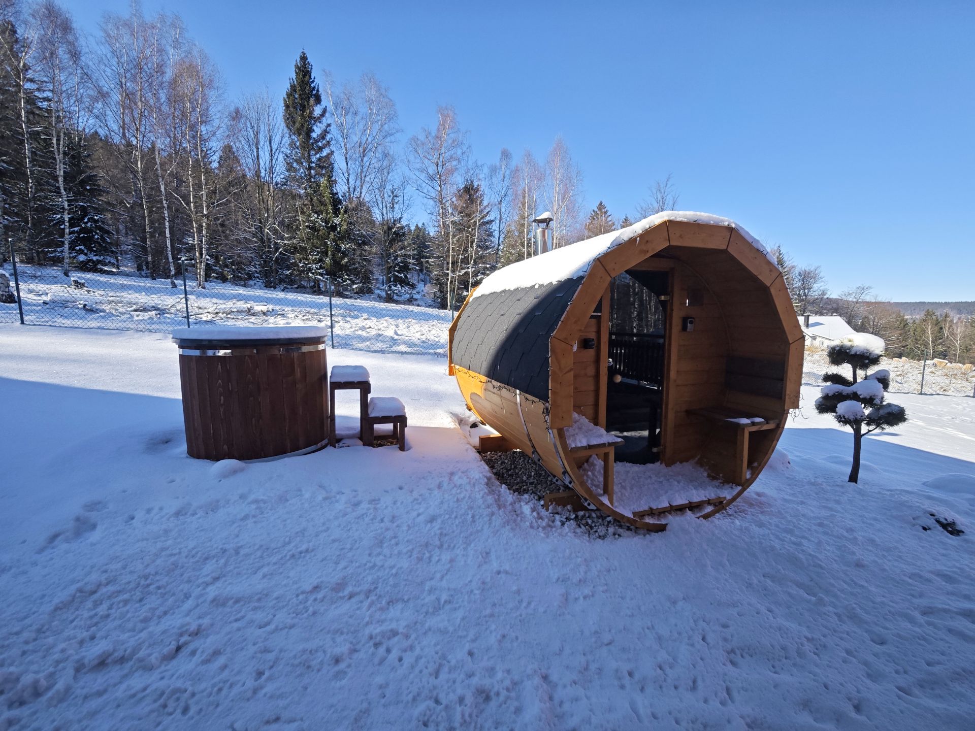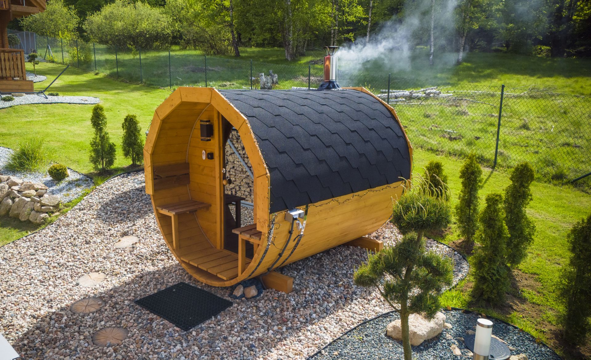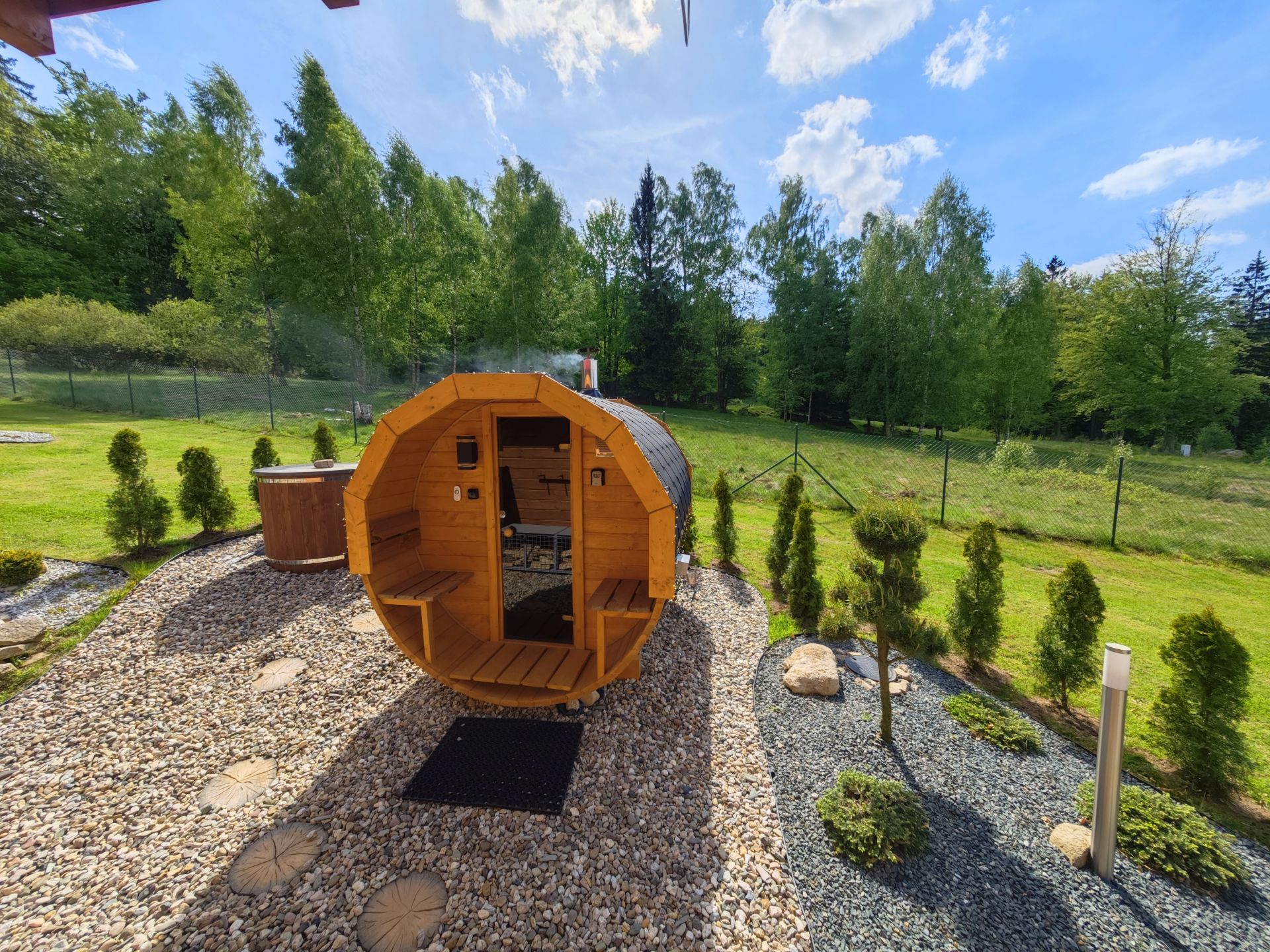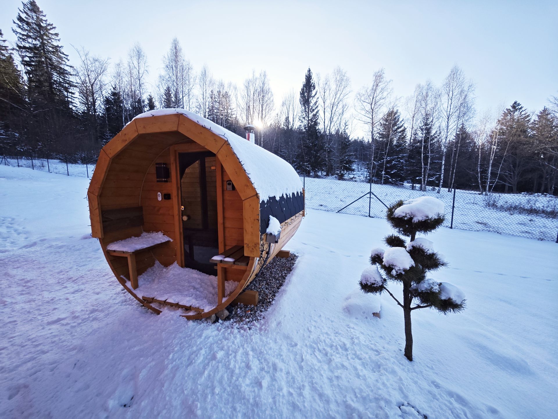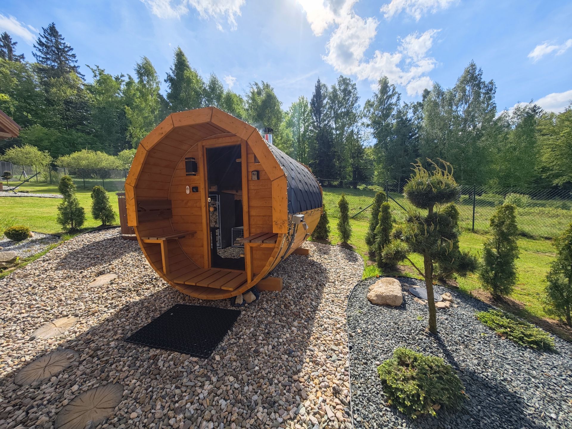 - Prywatna sauna sucha opalana drewnem z beczką do schładzania.