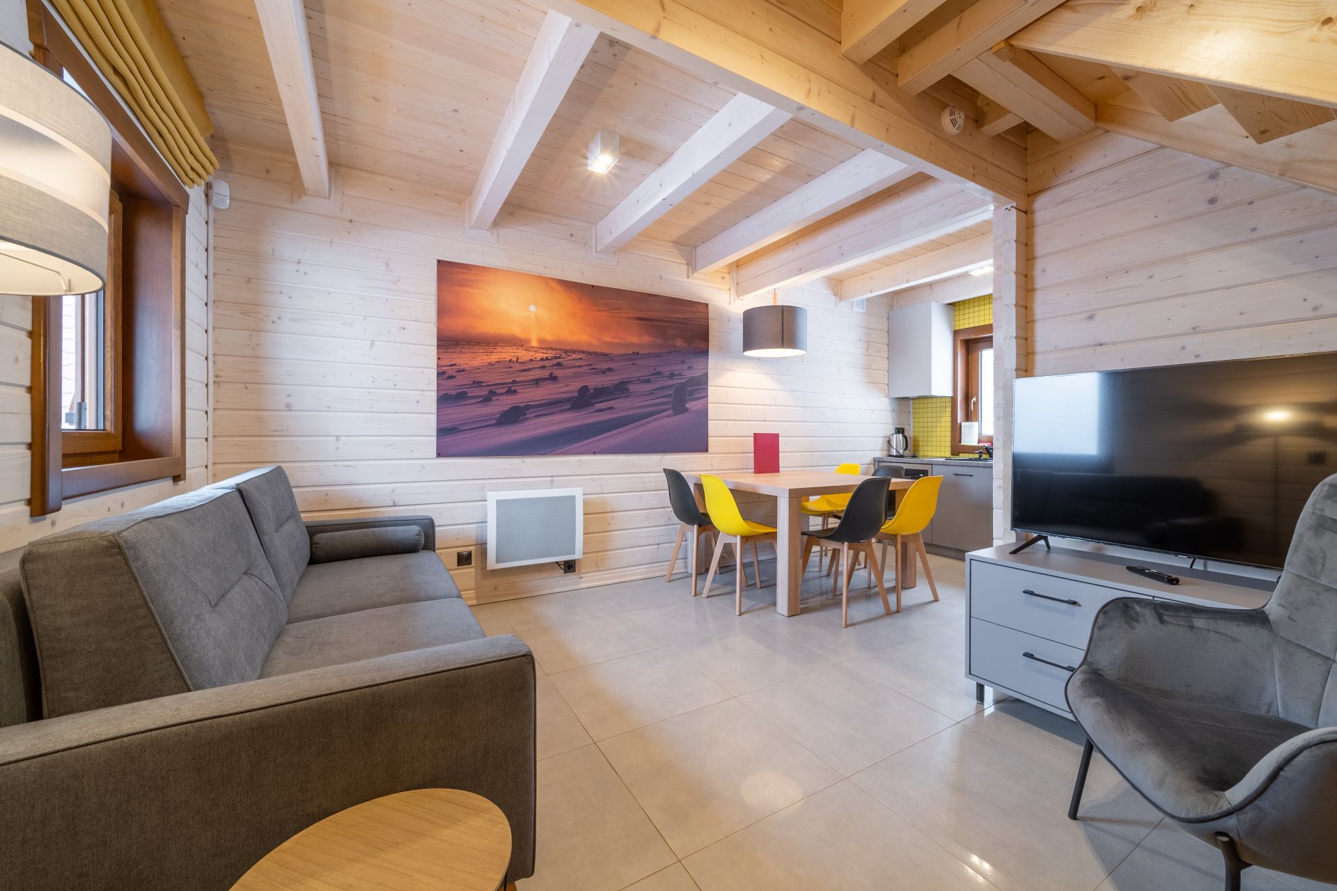 - Salon: Rozkładana kanapa (miejsce do spania dla 2 osób), fotel, telewizor 50-cali Ultra HD, stół jadalniany z 6 krzesłami.