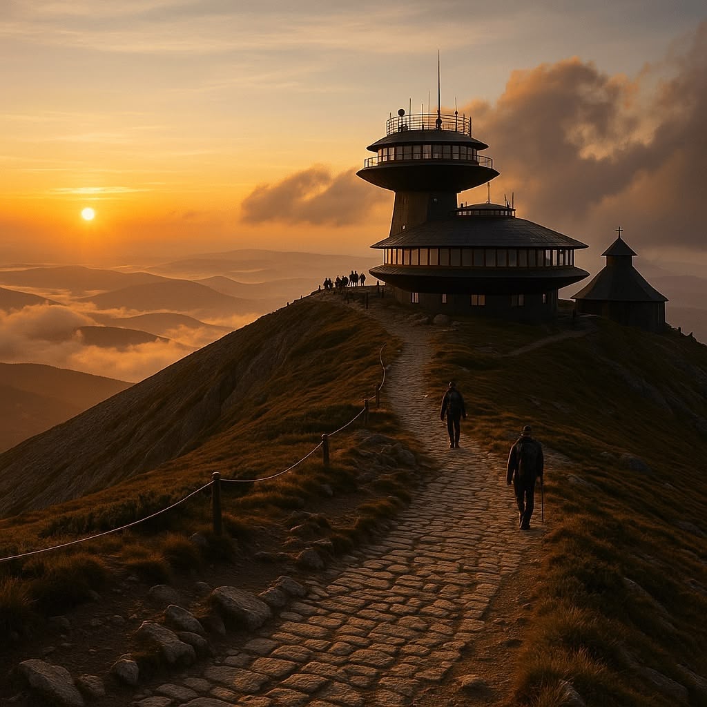 Najwyższy szczyt Karkonoszy i całych Sudetów, słynie z surowej pogody i szerokich, alpejskich panoram. Na wierzchołku znajdują się charakterystyczne budynki obserwatorium oraz kaplica św. Wawrzyńca. Wejście możliwe kilkoma szlakami; klasyk dla turystów o średniej kondycji.